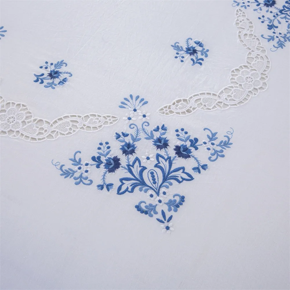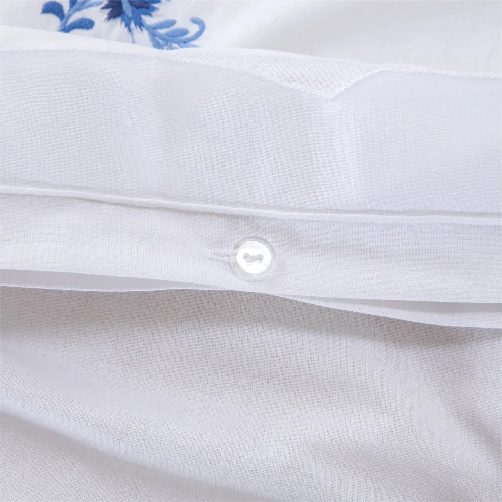 Enhance your bedroom with this elegant 3-piece duvet cover set, crafted from 100% premium white cotton for soft, breathable, and comfortable sleep. Featuring blue floral embroidery and refined perforated detailing, this set combines style and texture to elevate any bedroom decor.