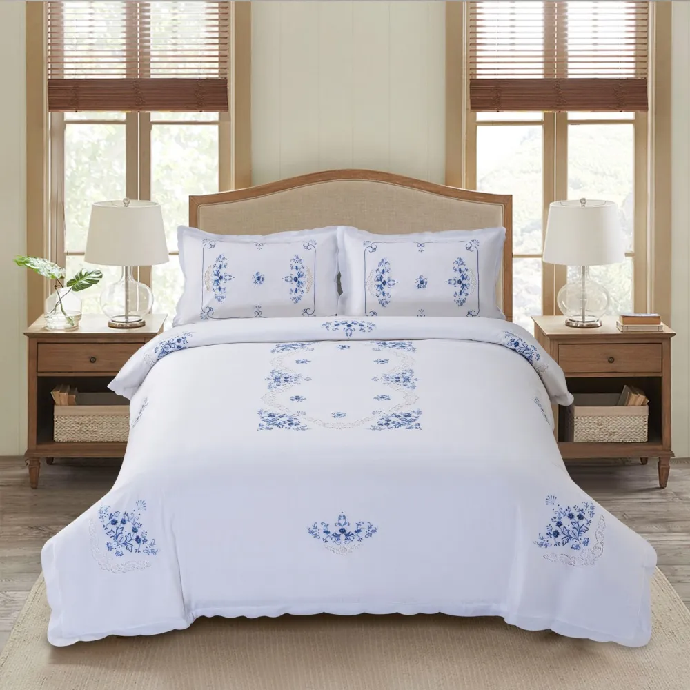 Features: • 100% Pure Cotton • Blue Floral Embroidery • Perforated Detailing • Soft & Breathable • All-Season Comfort • 3-Piece Set Set Includes: 1 × Duvet Cover, 2 × Pillowcases |